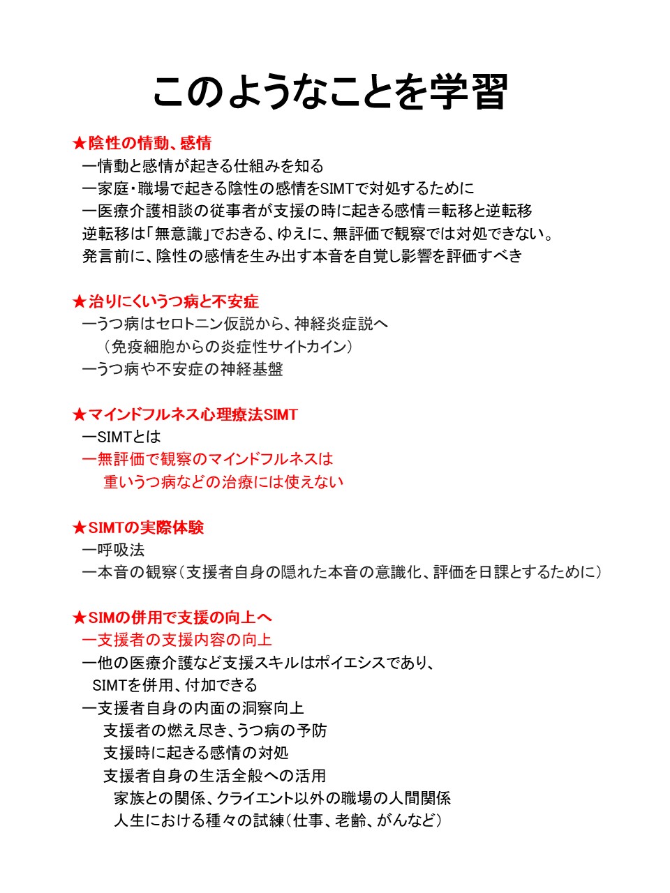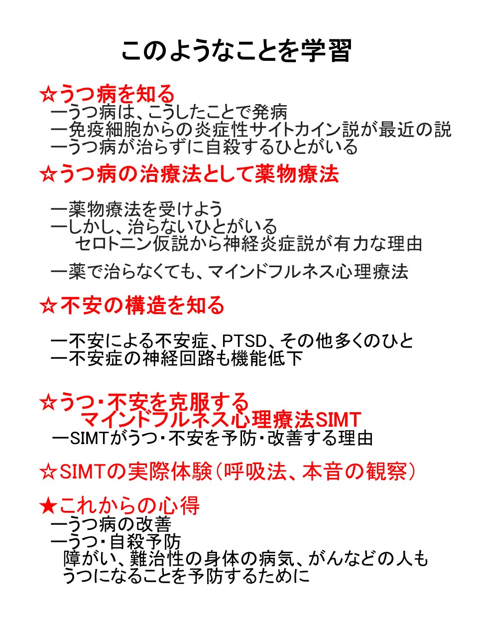 SIMTの呼吸法の実践と、うつを例に心身の作用を説明しようと考えています。